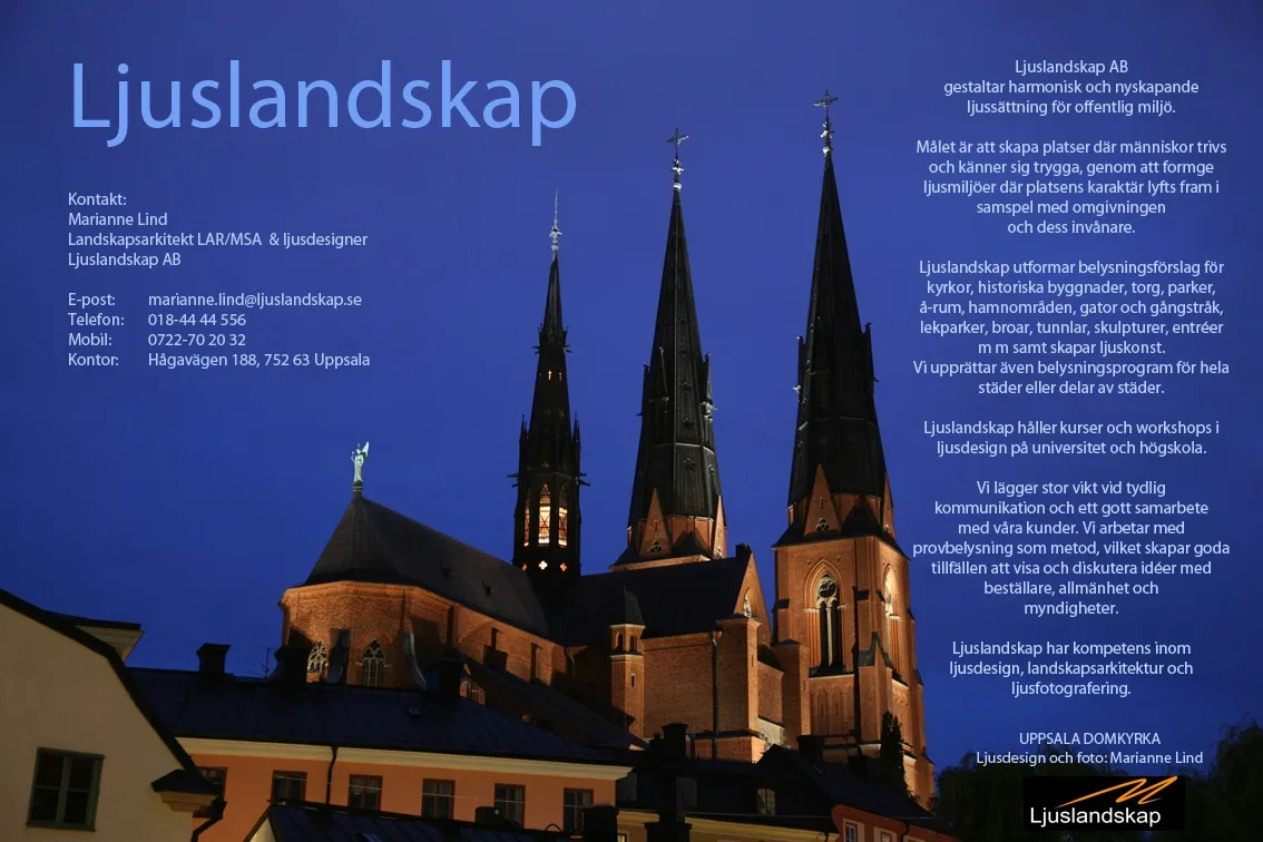 Jag som driver Ljuslandskap AB heter Marianne Lind och är utbildad landskapsarkitekt och ljusdesigner. Sedan 2003 har jag arbetat heltid med att ljussätta utomhusmiljöer i olika städer i Sverige.